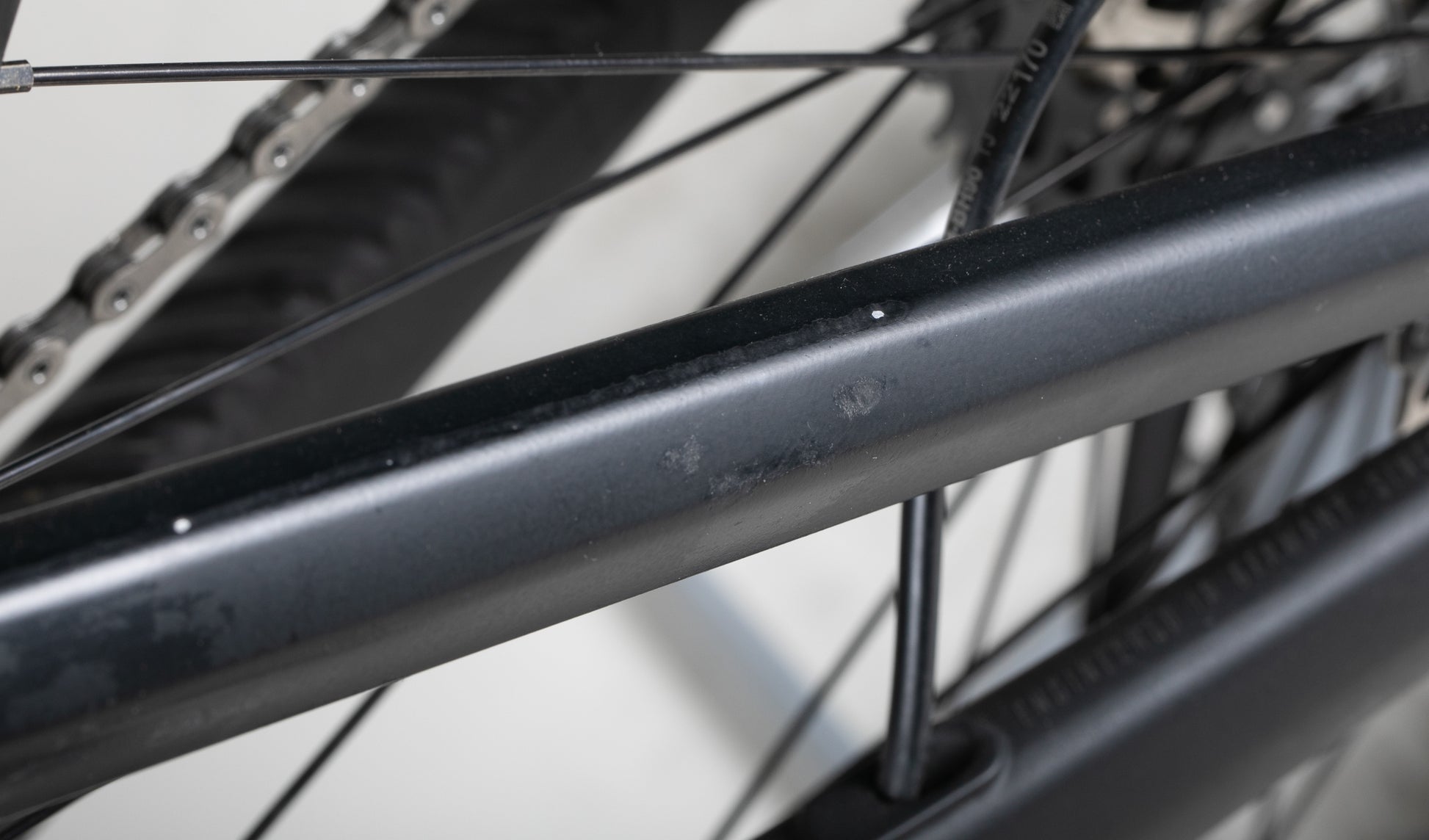 Sähköpyörä on hyvässä kunnossa. Siinä on vain vähäisiä käytön jälkiä takahaarukassa, etuhaarukassa ja takavaihtajassa sekä muutamia maastopyörälle tyypillisiä jälkiä runkokolmion alaosassa.