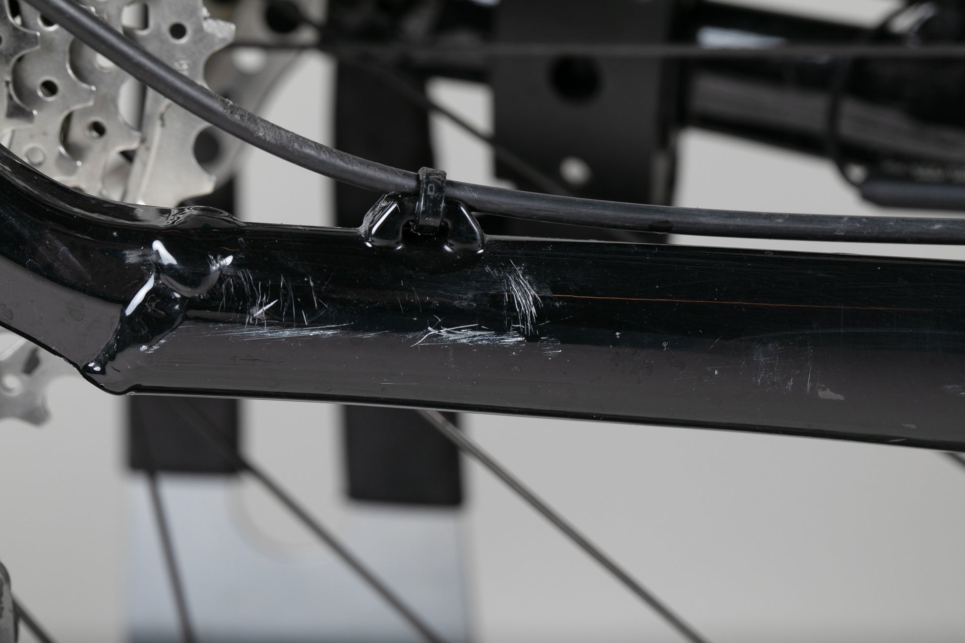 Sähköpyörä on hyvässä kunnossa, osoittaen vain vähäisiä käytön jälkiä. Pientä normaalia pintanaarmua löytyy maalipinnasta sekä takavaihtajasta.