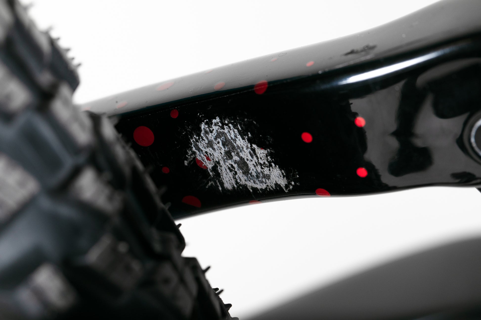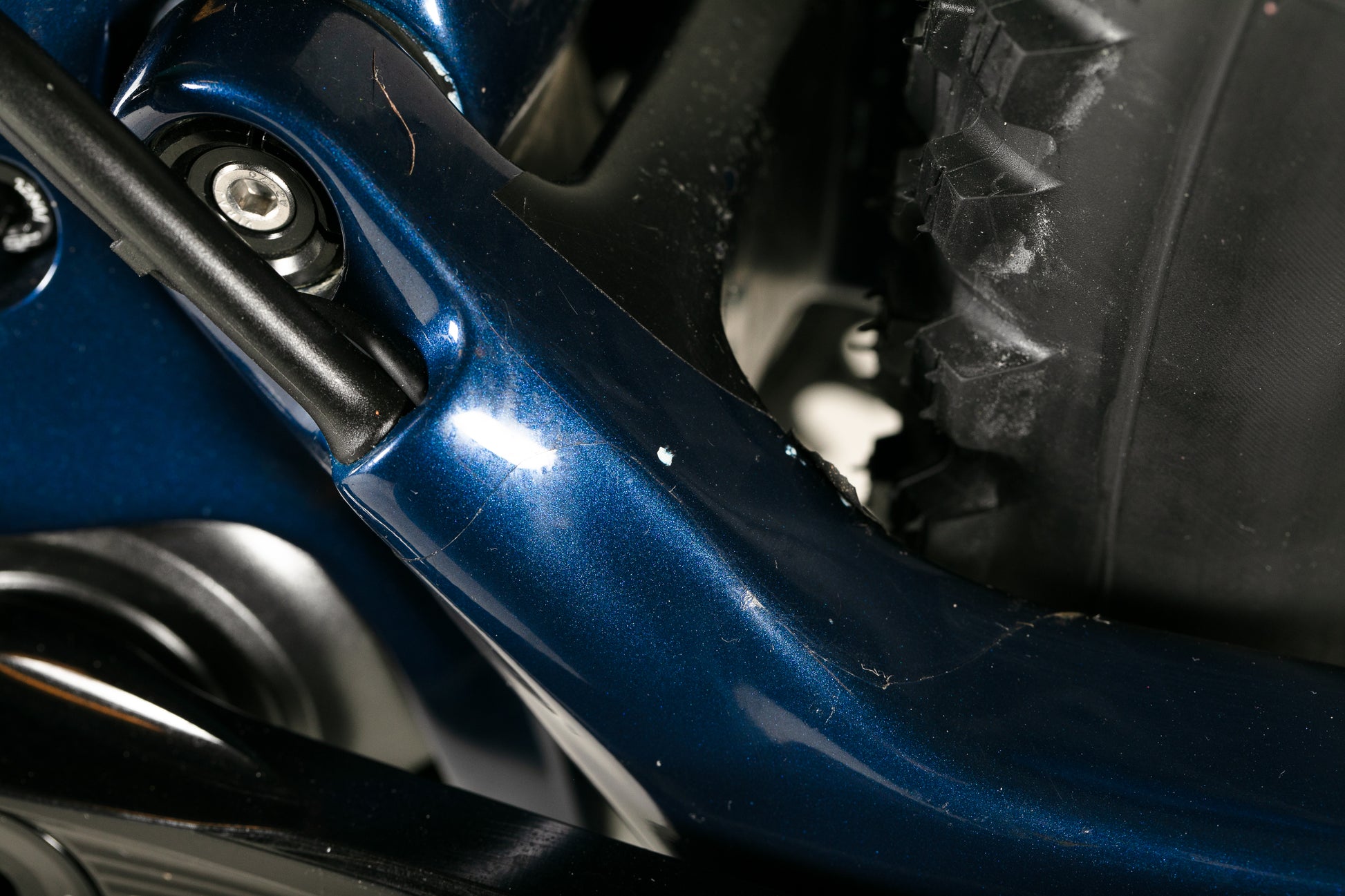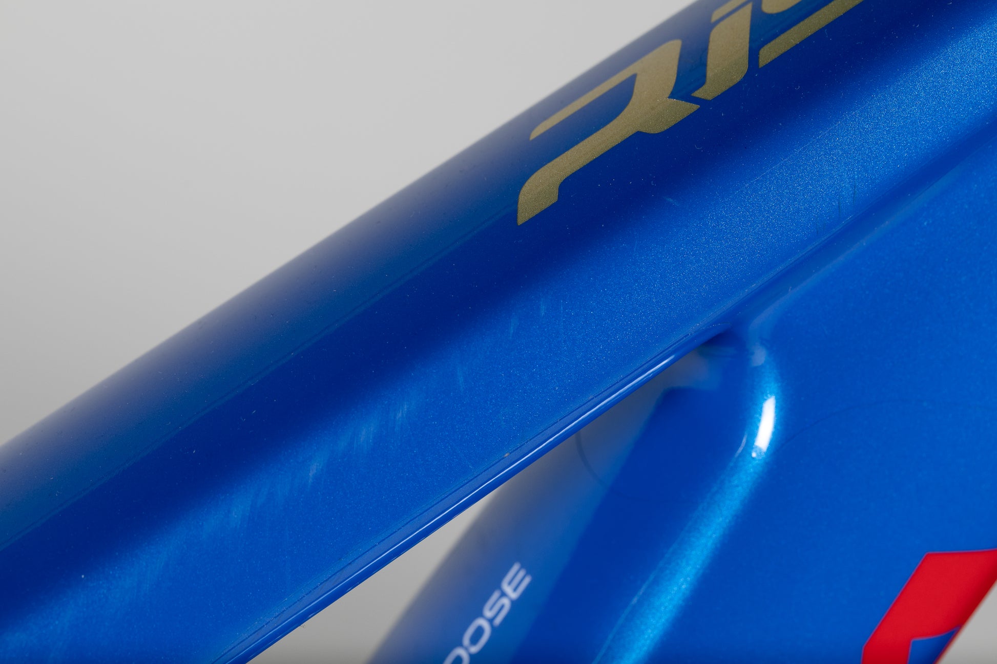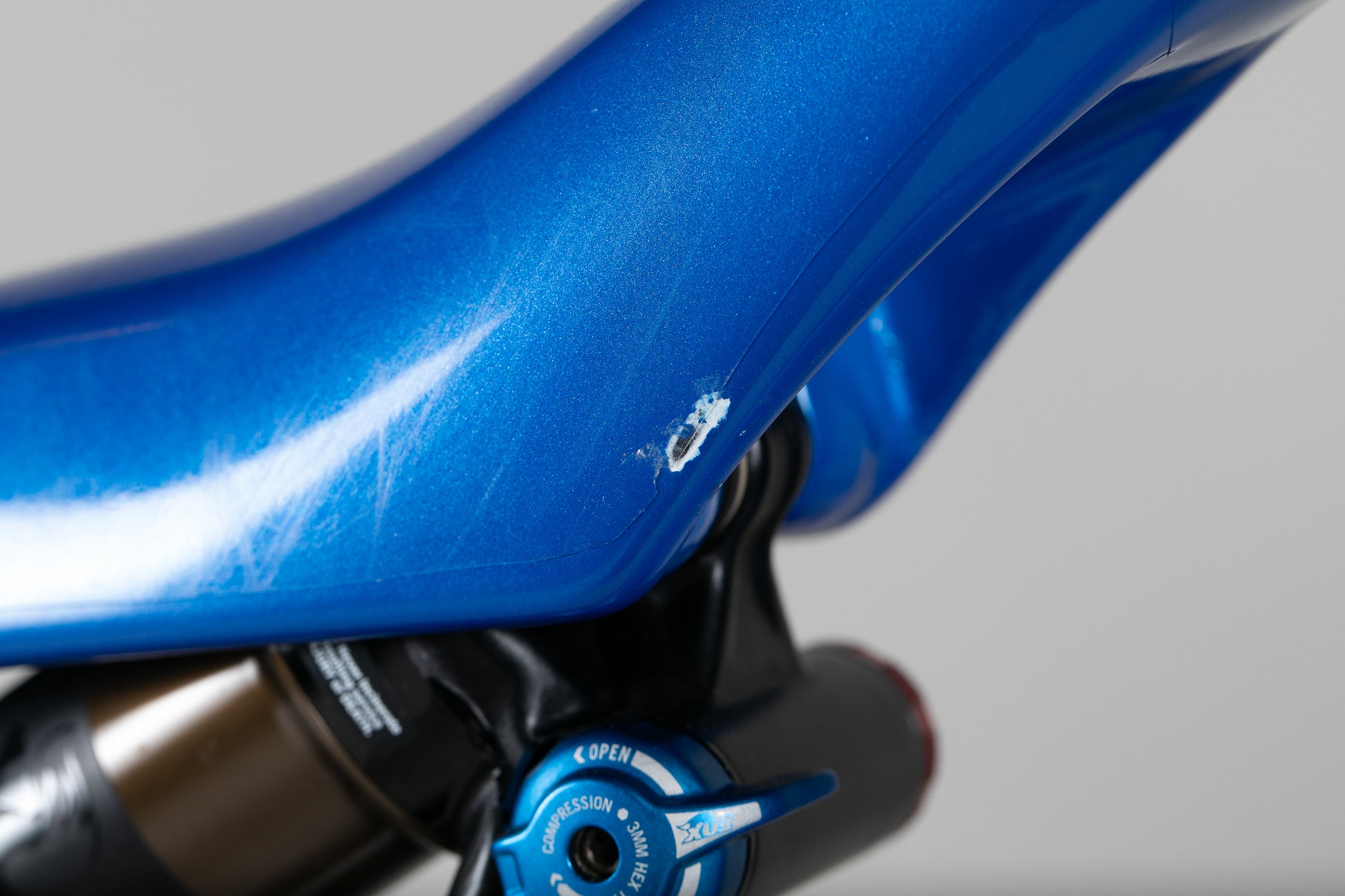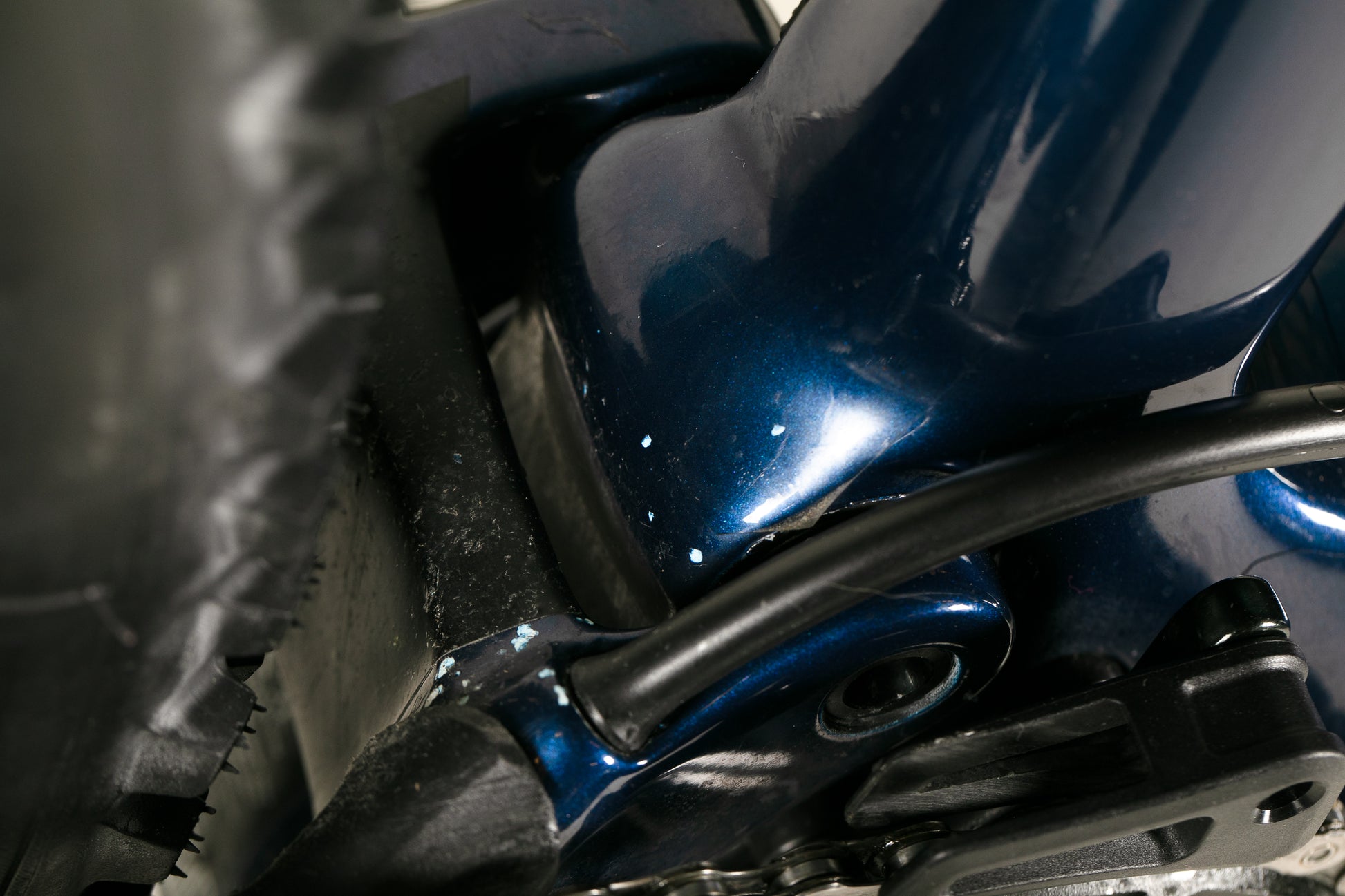 Tämä pyörä on todella hyvässä kunnossa. Melkein uutena suojateipattu. Maalipinnassa pientä kulumaa ja naarmua autotelineestä ja myös pientä kiveniskemää. Selkein kosmeettinen virhe löytyy takahaarukasta, jossa takalokari on kuluttanut maalipintaa molemmilta sisäsyrjiltä.